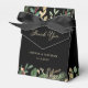 These gorgeous holiday wedding favor boxes feature elegant faux gold leaves, Christmas greenery, and red holly berries on a modern black background. The front flap says "thank you" in elegant calligraphy.