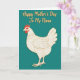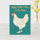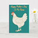 This greeting card features a deep teal background with a decorative white hen resting low on the front, outlined in shiny gold and filled with delicate curling gold lines that feel like a gentle embrace. Its comb and wattle are a rich red that draws your eye, like a small blush against the calm backdrop, and the tiny eye is a gold-rimmed dot that gives it a sweet, attentive look. A soft shadow under the hen makes it appear slightly lifted from the surface, adding depth without fuss. Centered above the hen, the message “Happy Mother’s Day To My Nana” is written in gold lettering with a faint shadow, keeping the words easy to read while still feeling special ❤️. The gold details throughout echo a sense of closeness, as if the careful patterning was made to mirror care passed from one generation to the next. The layout stays open and balanced, with the text in the upper half and the hen anchoring the lower half, leaving plenty of breathing room 🌼. The final look is a teal field with a white-and-gold patterned hen near the bottom and gold text centered above it.
