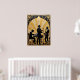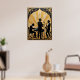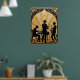 This ornate painting showcases a jazz trio silhouetted in deep black against a lavishly textured gold backdrop. A central female figure plays a trumpet, positioned between 3 male musicians, one with a trumpet and the other with a saxophone. A suggestion of a drum kit is visible behind them. The gold background is rich with swirling, embossed patterns and a prominent, stylized moon, creating a sophisticated and vintage jazz aesthetic reminiscent of the Art Nouveau or early Art Deco eras.