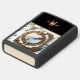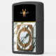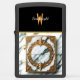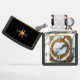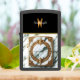 A gold-plated lighter with a marble design, featuring intricate details and a circular frame.