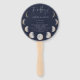 Elegant watercolor gilded moon phases wreath, wedding program hand fans, Background features dark navy blue color background.