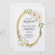 A lovely golden oval trimmed with white blossoms and printed on 110 lb weight of bright white fish paper with an embossed woven texture. Shown as a baptism invitation, it's well-suited for most happy celebrations. (Vector created by freepik - www.freepik.com). The card is easy to customize with your wording, font and font color. Not exactly what you're looking for? All our products can be custom designed to meet your needs at no extra charge. Simply contact us at askcottonlamb@gmail.com. Coordinating products available at your request at no additional charge.