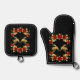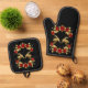 An elegant oven mitt and pot holder set with red roses and golden hummingbirds, set on a black background.