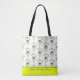 Stylish reversible tote bag printed front and back with hand drawn gin cocktail glasses with ice, lemon slices and bubbles. There's a customisable strip across the front and back to add your own name or message