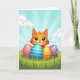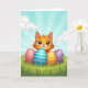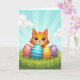 This greeting card shows a friendly ginger cat with wide, shining eyes and a small pink nose peeking from behind four decorated eggs, as if sharing a secret with you 🌷. The cat’s gentle gaze and slight tilt of its head add a sweet, companionable feel, like it’s inviting someone close to join the moment. In front, the eggs line up across the lower half: one pink with diagonal stripes, one blue with wavy lines, one yellow with horizontal bands, and one purple with white dots 🐰. They rest in bright green grass textured with tiny blades and scattered little white flowers, suggesting a fresh spring morning. The background shifts into a clear blue sky with soft clouds drifting near the top, keeping the scene airy and light. A short Easter greeting sits near the upper portion in a simple, rounded font, colored to stand out against the sky. Behind it all, a golden sunburst spreads outward in neat rays from a bright circle near the top center.