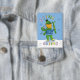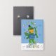 Fun blue and white winter rectangular button featuring a cartoon ginger cat going skiing .