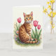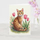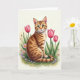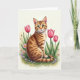 Designed with a soft, painterly look, this card features a tabby-patterned cat centered in a spring garden scene, its ginger-and-brown stripes giving the fur a plush, touchable feel. The cat sits calmly on a patch of green grass, looking outward with wide emerald eyes that feel like a quiet, affectionate hello ❤️. Tall pink tulips rise on either side like gentle guardians, their closed petals in rich fuchsia adding a romantic, bouquet-like touch to the scene. A creamy, lightly faded background keeps everything airy and focused on the cat and flowers, like a tender moment paused in a garden. Near the foreground, small wildflowers in soft purple and pastel pink scatter across the grass, adding delicate detail and a friendly, cozy atmosphere 🌼. Soft, diffuse lighting warms the cat’s coat and softly brightens the tulip petals without harsh shadows. There is no border, and the tulips frame the cat while the tiny blossoms dot the lower area in loose clusters.