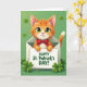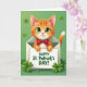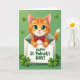 This card shows a cartoon ginger cat peeking out from a white envelope, as if it’s popping in to flirt with the reader in the sweetest, friendliest way 💚. The cat’s orange fur has light stripes, with a white muzzle and chest, and a little bit of its tail curling out behind for extra charm. Its large emerald-green eyes look straight ahead with a tender, inviting gaze, like it’s sharing a private St. Patrick’s Day hello. A bright red bow tie sits neatly at its neck, adding a dressy touch against the warm fur. One paw holds up a small white card in front, where the message “HAPPY St. Patrick’s DAY!” is printed in dark lettering that stands out clearly. The background is a rich green with a soft texture, dotted with four-leaf clovers floating and resting around the scene ☘️. The envelope edges, clover shapes, and the cat’s bow tie are outlined crisply against the green backdrop.