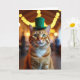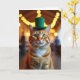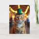 Designed with a close-up portrait of a ginger tabby cat centered on the front, this St. Patrick’s Day card draws you in with its calm, friendly face and a tiny green top hat perched neatly between its ears ☘️. The cat’s emerald-green eyes catch the light and seem to hold a soft, affectionate gaze, like it’s looking at a favorite person. Warm orange and brown stripes flow across its fur, with fine texture that makes it look plush and touchable. Long white whiskers fan outward, framing the muzzle and adding a gentle, refined look. Behind the cat, the background falls into a soft blur of golden lights that curve in an arc, like string lights at a cozy evening gathering 💚. The main greeting text sits near the top in green, while a smaller line of text appears near the bottom in a lighter green for balance. The little top hat is a rich green with a darker band, set against the glowing bokeh of warm golden orbs.