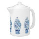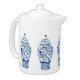 This is a teapot featuring a design from an original gouache/ink painting by artist Anne Harwell McElhaney.The 7th ginger jar print in my her ongoing series. Features a classic blue and white Chinoiserie porcelain ginger jar with 5 images circling the girth of the teapot