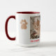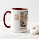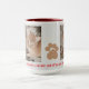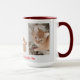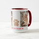 Two photos of the kitten, humor red text saying, "Find yourself a cat who looks at you like this", and the cat's paws, all on a pale grey background, in contrast with the brown inside of the mug.