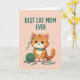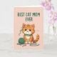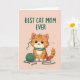 This card shows a sweet ginger kitten sitting near the bottom of a wide peachy-pink background, drawn with warm orange and creamy white fur and a soft, fluffy look. Its big glossy black eyes with tiny white highlights and a small upturned smile give it a tender, affectionate expression ❤️. Beside the kitten rests a deep green ball of yarn, with a few loose strands looping around its neck like a gentle hug and trailing across the pink ground. A small pale pink heart floats close to the kitten’s right ear, adding a quiet note of closeness and care. Across the upper area, the phrase “BEST CAT MOM EVER” appears in large green letters, centered and easy to read. The simple shapes and smooth outlines keep the focus on the kitten’s loving gaze and the cozy yarn details. The green yarn strands curl in loose arcs across the lower foreground, with the heart hovering just above the kitten’s ear.