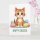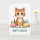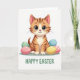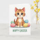Designed with a sweet digital illustration, the card centers on a ginger-striped kitten with soft orange fur and darker bands, gazing out with large green eyes that seem to linger on you like a close friend. Its tiny pink nose and fine whiskers sit above a creamy white chest, giving the face a tender, affectionate look. Around the kitten, smooth egg-shaped forms cluster like a little spring nest, colored in mint green, blush pink with light polka dots, sunny yellow, and calm blue 🌷. The eggs sit on a muted green ground that gently frames the scene without pulling focus. The lighting is bright and even, keeping the edges crisp and the pastel colors softly glowing. Near the bottom, a festive greeting is placed in verdant green lettering, centered beneath the illustration. A few eggs overlap slightly in the foreground, with the pink one showing tiny dots and a blue one tucked just behind the kitten’s paw 🐇.