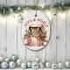 On the front of this Holiday ornament is an image of an adorable ginger orange striped kitten peeking out of a Christmas gift box. The box is also filled with green holly leaves and red berries, and is decorated with pink ribbon and bows. Behind the image is a gold confetti sprinkle background. The text above the image says "Joy to the World". The back of the ornament has the same confetti background and text fields for you to personalize each ornament.