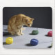 Ginger tabby cat sitting on table looking at woollen balls | Michael Blann | AssetID: sb10069719m-001