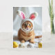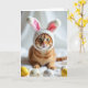 This greeting card shows a ginger tabby cat posed front and center on a plush, pale blanket, looking straight out with a steady gaze that feels like a friendly, close-up hello 🐰. A soft white knit bunny hat sits snugly on its head, with tall ears lined in light pink and topped by two fluffy pom‑poms 🐇. The warm orange fur and darker stripes stand out against the light hat, and the cat’s green‑gold eyes give it a tender, patient look, like it’s quietly keeping someone company. Gentle, diffused lighting smooths across the scene, giving the coat a cozy glow while the background fades into a creamy blur. Near the top, the greeting appears in small, light gray lettering, leaving plenty of open space around the cat’s face. The text sits centered above the ears so the expression stays the focus, as if the card is sharing affection through eye contact rather than big words. In the lower foreground, a few decorative eggs in soft yellow and speckled white rest near the cat’s paws, with the knit ribbing and fine whiskers sharply detailed.