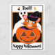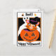 Ginger's an orange cartoon cat in an adorable black & purple witch costume, complete with pointy hat & cloak. She's sitting inside a jack o'lantern. A white ghost floats behind her. Trick or Treat! The background can be any color.