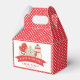 This favor box is perfect for gifting cookies and features a collection of festive Christmas cookies with text that says "Baked with love." . You can personalize with your family name and year. The background is red with white polka dots. Coordinates with the Christmas Cookie Exchange collection.