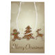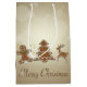 Elegant and delicious Christmas illustration: Decorated gingerbread Christmas tree, gingerbread man and gingerbread deer with golden stars on a brown bokeh background.