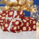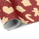 This cute holiday wrapping paper features a pattern of tan gingerbread cookies of stockings, gingerbread men, candy canes, bells, Christmas trees, and more on a background of burgundy red with white dots. Designed by artist Susan Coffey.