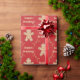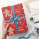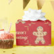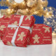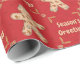 Here we have a wrapping paper that features a cutout of a gingerbread cookie with lots of cookies inside of it, and the words Seasons Greetings inside of a frame made of rolling pins with light polka dots on a deep red colored background. This paper is available in multiple sizes and is a match to other wrapping papers, tissue papers, gift bags and a greeting card. This is sure to make a perfect addition to your gifts this holiday season.