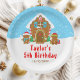 This cute and festive plate features a cute gingerbread house decorated with red and green candy. Beside it are adorable gingerbread men with gifts, dressed in Santa hats and a scarf. In the background is a bright blue winter sky with elegant falling snowflakes. The text combines decorative and sans serif fonts for a stylish and modern look. This is perfect for a Christmas gingerbread house decorating party.