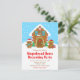 This cute and festive invitation features a cute gingerbread house decorated with red and green candy. Beside it are adorable gingerbread men with gifts, dressed in Santa hats and a scarf. In the background is a bright blue winter sky with elegant falling snowflakes. The text combines decorative and sans serif fonts for a stylish and modern look. This is perfect for a gingerbread house decorating party.