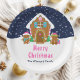 This cute and festive plate features a cute gingerbread house decorated with pink and green candy. Beside it are adorable gingerbread men with gifts, dressed in Santa hats and a scarf. In the background is a navy blue winter sky with elegant falling snowflakes. The text combines decorative and sans serif fonts for a stylish and modern look. This is perfect for a Christmas gingerbread house decorating party.