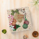 A cute design of a gingerbread man cookie with candy cane. Wire corner piece holding paper tag and elegant ornaments. Fill with family recipes could make a great gift