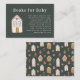 Whimsical Christmas theme baby shower book request card featuring illustration of a gingerbread house with blue accent. The card asks guests to bring in a new or used children's book instead of a card.