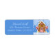 Cute blue Holiday return address labels with a whimsical gingerbread house . Use the template to replace the place holders with your own name and address .