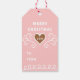 These gingerbread house gift tag have a place on the back for you to write in who the gift is for (to and from). On the back you can customize the greeting and the year. Colors include, brown, pink and white.