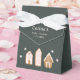 Modern Christmas theme baby shower favor box featuring illustration of gingerbread houses with pink accents.