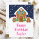 This cute and festive birthday postcard can be personalized with a name or title such as daughter, granddaughter, niece, friend etc. The design features a cute gingerbread house decorated with pink and green Christmas candy. Beside it are adorable gingerbread men with gifts, dressed in Santa hats and a scarf. In the background is a navy blue winter sky with elegant falling snowflakes. The text is in a bold and festive font. This is perfect for Christmas and the winter holiday.