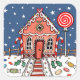 A colorful illustration of a festive gingerbread house. The outside of the house is decorated with two candy canes and has a large lollipop tree in the garden. The ground is covered in bright white icing sugar snow and strewn with sweets.