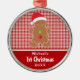 Cute cartoon clipart graphic a gingerbread man decorated with a red button and a green button wearing a red and white santa hat. Background image is a red gingham checked pattern. Personalize the solid red area at the bottom of the ornament with your baby's first and the current year. Click "Customize It" to make even more changes to the design by resizing, adding, or removing elements or changing the font or text size. Also available in a girl version and 3 twin versions.