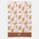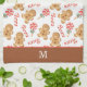 This seasonal kitchen towel has a fun Holiday pattern made of gingerbread man images, candy canes and lollipops. The pattern is placed on a white background. One end has a matching brown border with your monogram or other custom text. Fun for the Christmas Season!