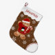 Bring cozy holiday cheer to your mantel with this adorable gingerbread man Christmas stocking! This festive design features a smiling gingerbread cookie wearing a red puffy sweater with a snowman design, a Santa hat, and holding a candy cane. Set on a classic brown background with delicate white snowflakes, this stocking captures the warmth and sweetness of Christmas. Perfect for holiday décor, family stockings, or as a personalized gift for kids and cookie lovers.