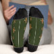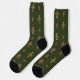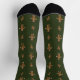 A pattern of cartoon-style gingerbread men with all the classic adornments, including gumdrop buttons and frosting details, decorates a forest green background to create a fun and playful pair of socks for the Christmas season.