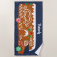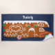 This personalized beach towel makes a perfect Christmas gift for RV owners. It features an illustration of a gingerbread RV. This festive cookie camper is decorated with white icing and red and green candy and set against a navy blue background. The towel is ready to be personalized with a name or other custom text at the top.