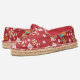 Espadrilles with a pattern of smiling gingerbread Santa characters and snowflakes. The inner lining of the shoes is red.