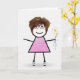 Cute stick girl with hair, pearl necklace, pink gingham dress, glasses, sneakers, and holding a daisy bouquet for a funny birthday.