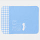 Cute simple white car graphic art in blue and white gingham patterned baby blanket. Would make a great baby shower gift, or newborn present for a little newborn baby boy. Personalise with your baby name. Original art and design by Sarah Trett.