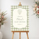 Sage green gingham baby shower welcome sign featuring a delicate bow and soft floral accents. Designed to greet guests and create a calm, elegant first impression at your baby shower. Perfect for neutral baby showers, girl or gender neutral themes, spring celebrations, and sage green or gingham decor. Easy to customize and print for entryway display, easel signage, or welcome table decor.