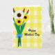 This design shows a festive bouquet arranged on the left, with three round flowers—one white bloom with a dark brown center and two golden-yellow blooms with deep centers—leaning close together like friends in a warm embrace ❤️. Slim red buds rise between the blossoms, adding little sparks of color that feel like shared laughter. Below, emerald-green stems and broad leaves gather neatly, tied with a sky-blue bow that sits like a gentle hug around the bundle. Behind everything is a soft checkered background of butter yellow squares alternating with slightly deeper golden tones, giving the scene a cozy, kitchen-table feel 🌼. On the right side, the words “Happy Mother’s Day” are placed in flowing black lettering, spaced to balance the bouquet without crowding it. The high-contrast colors—yellow, white, green, red, and blue—stand out clearly against the warm checked backdrop, keeping the look bright and easy to read. The bow is centered at the base of the stems, with two ribbon tails pointing downward over the green leaves.
