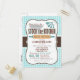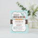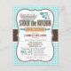 Cute Stock the Kitchen bridal wedding shower invitation on brown and aqua turquoise gingham pattern. Features retro rolling pin, mixing bowl, knife, and measuring cups cooking utensils. Invite friends to stock the bride's kitchen and pantry with food and appliances.