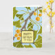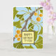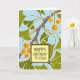 Arts & Crafts "Ginkgo Dance" Design Birthday Card. This block print style design features green Ginkgo leaves waving or 'dancing' in a summer breeze against a blue sky background with orange and yellow marbled fruits suspended by slender green hanging branches.