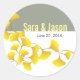 This round wedding sticker has gold Ginko leaves scattered from the left side to the right side and the top portion of the label is a solid grey color. Personalize with the bride and groom's names and wedding date. See www.zazzle.com/daisylin712 for matching wedding invitation and RSVP card.