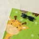 Take your children on an adventure with this cute giraffe themed beach towel. Using a green polka dot backdrop there is a giraffe and palm tree pattern that fills the design. At the bottom is a green and light brown box from inserting a name. Personalize your giraffe themed beach towel today!