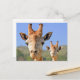 Postcard featuring a close up of two gentle, sweet giraffes as they walk against a sunny blue sky with green hills in the background. Photo taken in San Diego, California.